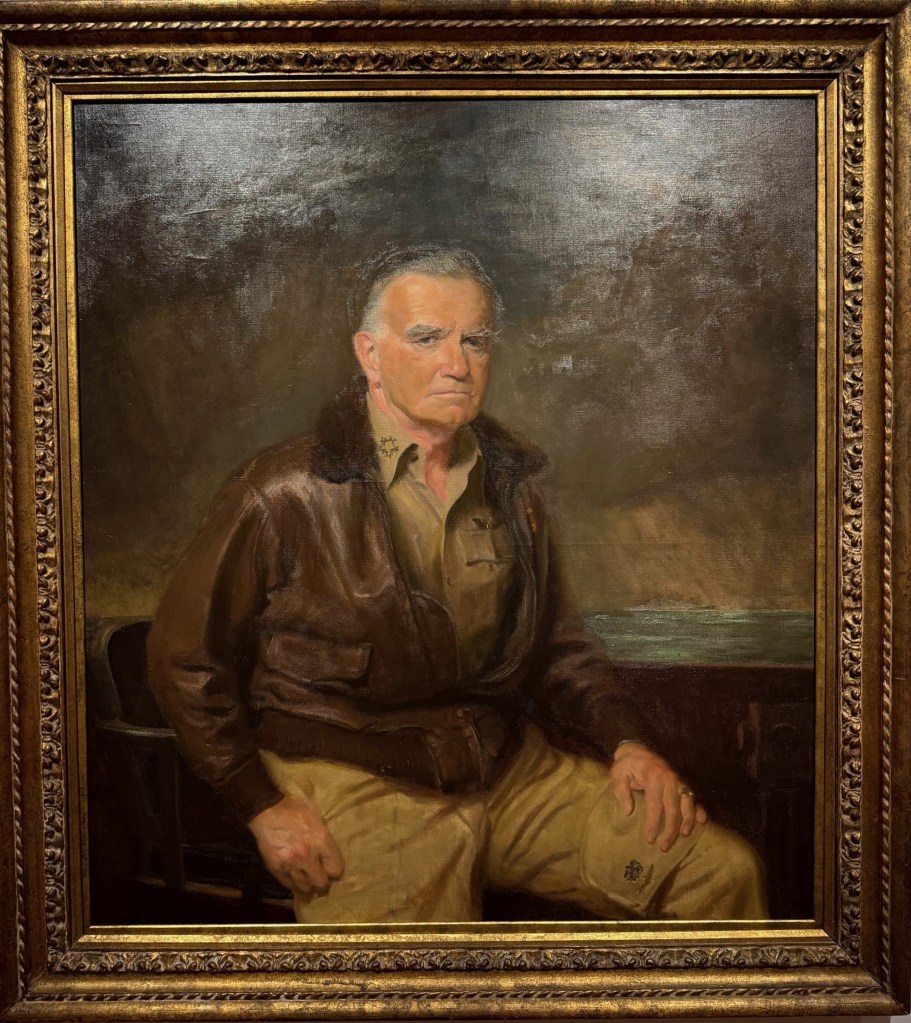 Exhibition Label: “In the first months after Japan’s attack on Pearl Harbor on December 7, 1941, and American entry into World War II, the Japanese push to dominate the Asian Pacific seemed unstoppable. As commander of the Pacific Fleet, Admiral Chester Nimitz was charged with halting that drive and halt it he did. Under his orchestration, American naval forces turned back the Japanese at the Battle of the Coral Sea in May 1942, and during the Battle of Midway that June, they dealt a blow from which Japan’s navy never recovered. By war’s end, Nimitz was one of the most respected leaders of the Allied cause. It is thought that the backdrop in Nimitz’s portrait is the wreckage left by the Japanese at Pearl Harbor. The picture thus marked the moment when Nimitz took command of the effort to come back from that devastating disaster.”